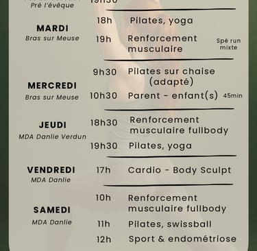 Je propose une variété de cours adaptés aux besoins des femmes, alliant sport et bien-être.