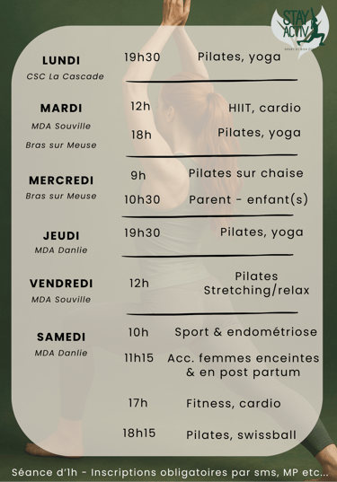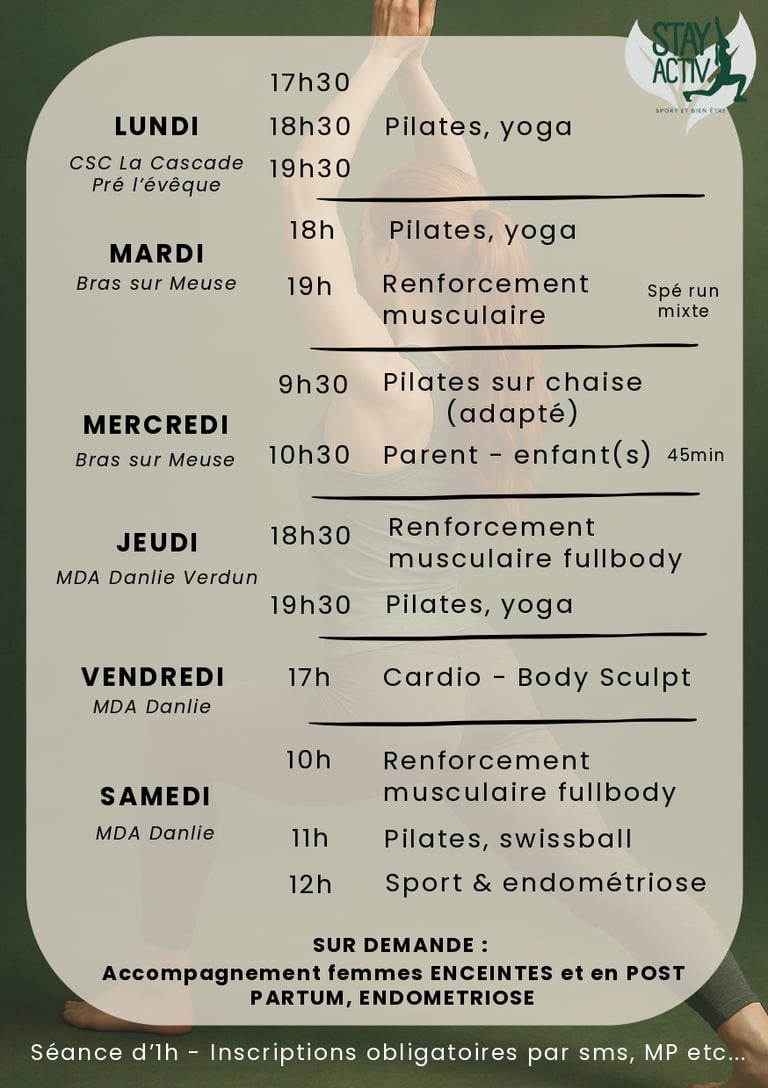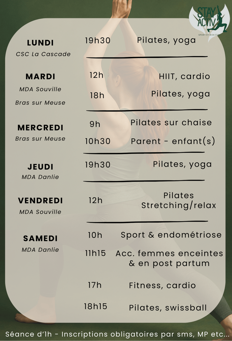 Mes séances incluent du renforcement musculaire doux ou dynamique, du stretching, du yoga, du pilate et des activités de relaxation.