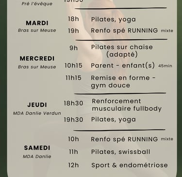 Je propose une variété de cours adaptés aux besoins des femmes, alliant sport et bien-être.
