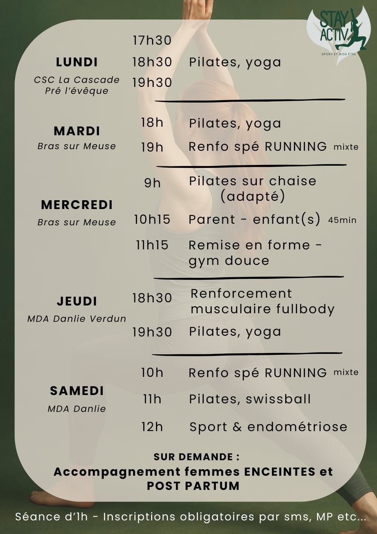 Mes séances incluent du renforcement musculaire doux ou dynamique, du stretching, du yoga, du pilate et des activités de relaxation.